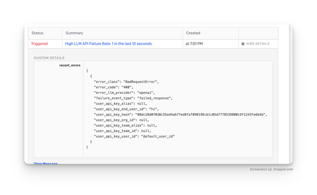• High LLM API Failure Rate. Configure X fails in Y seconds to trigger an alert.
